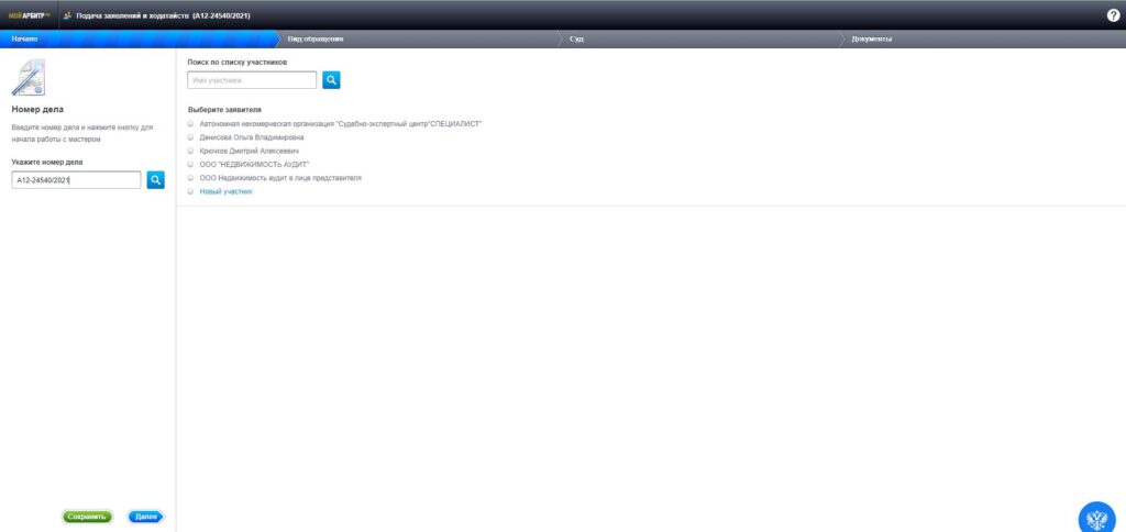 В меню выберите Заявителя из списка либо отметьте «Новый участник».