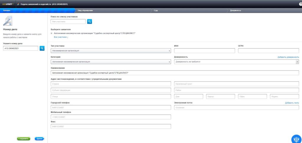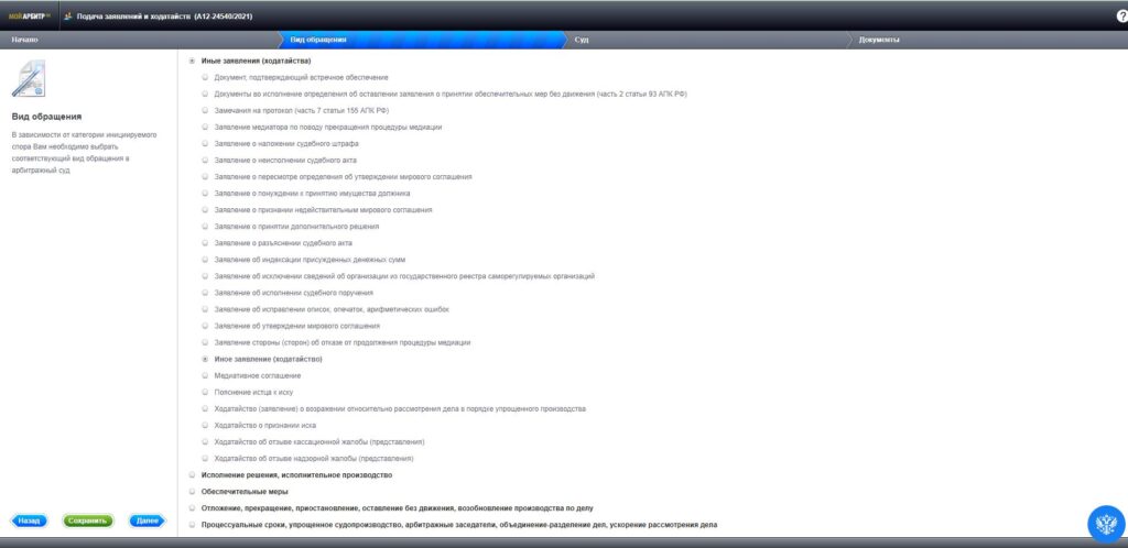 Шаг 2. Выбор типа судопроизводства и типа обращения