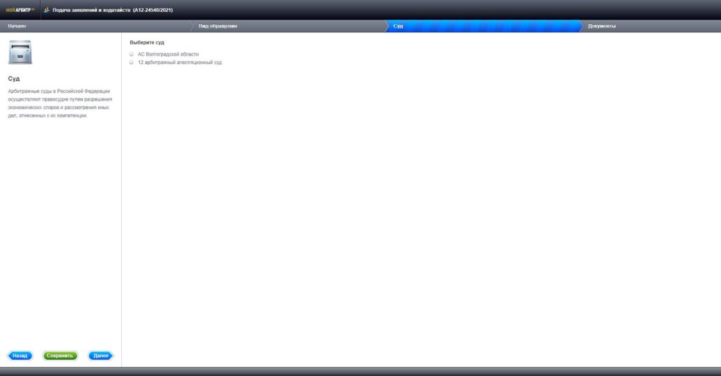 Во вкладке «Суд» следует осуществить выбор суда, в который должно поступить ваше обращение. Например:
