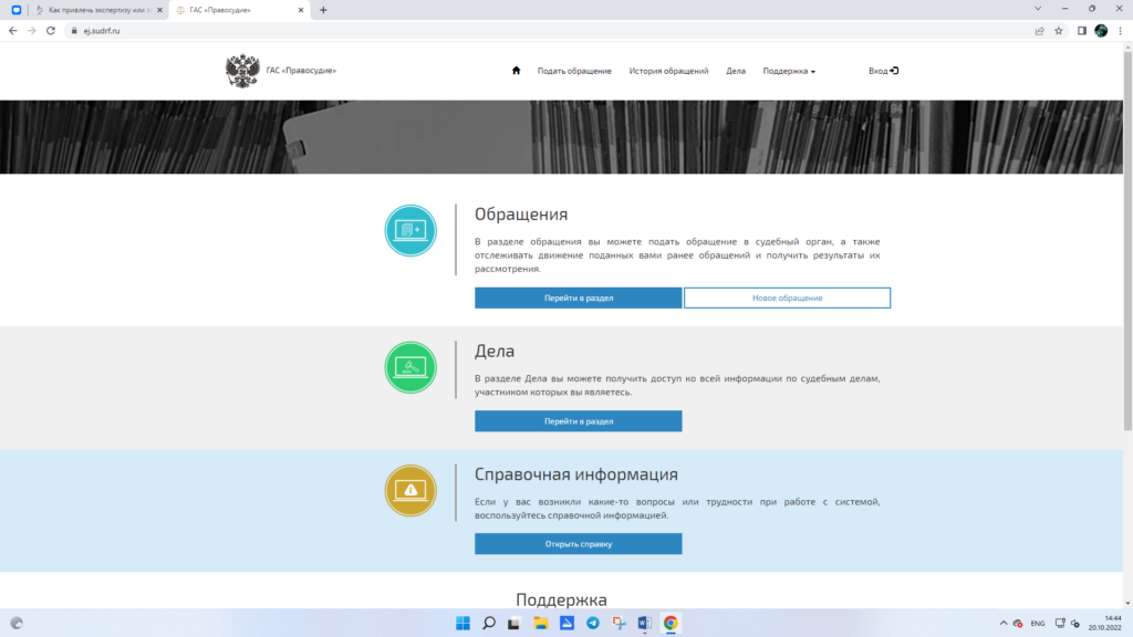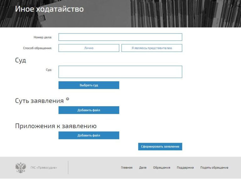В открывшемся окне введите номер дела, выберите способ обращения, выберите суд, в который должно поступить ваше обращение. В «Суть заявления» необходимо прикрепить ваше ходатайство, а в «Приложения к заявлению» загрузить заключение.