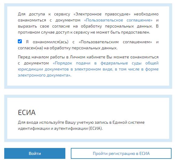 Следует выбрать “Войти через портал Госуслуг”, чтобы использовать все возможности сервисов Электронного правосудия.