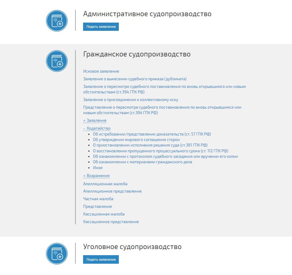 На открывшейся странице выбираем вид судопроизводства — административное, гражданское или уголовное.